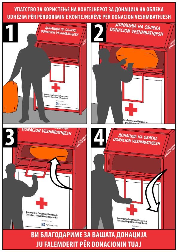 Една од основните активности на Црвениот крст е прием на донации во облека и дистрибуцијата на истата до оние на кои им е најпотребна. Оваа активност со голем интензитет започна да се унапредува и развива во 2013 година, преку поставување на 8 контејнери за донирање на облека на повеќе локации низ градот Скопје.